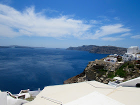 After Akrotiri we headed to the center of the island and its capital, Fira. Fira's population doubles in summer, and it's a very popular tourist town. The hordes here crowding the streets and overwhelming the vistas made me a bit crazy. I'd only come back off season. The walk up the hill to the Orthodox cathedral was worth it for the gorgeous views of the entire caldera, most of it now covered in water, and the outlying islands, one of them an active volcano with five craters. I stopped for a baklava, which was divine. This is the baklava I grew up with, drenched in honey and with not a trace of rosewater or semolina or other grains. I adore it.